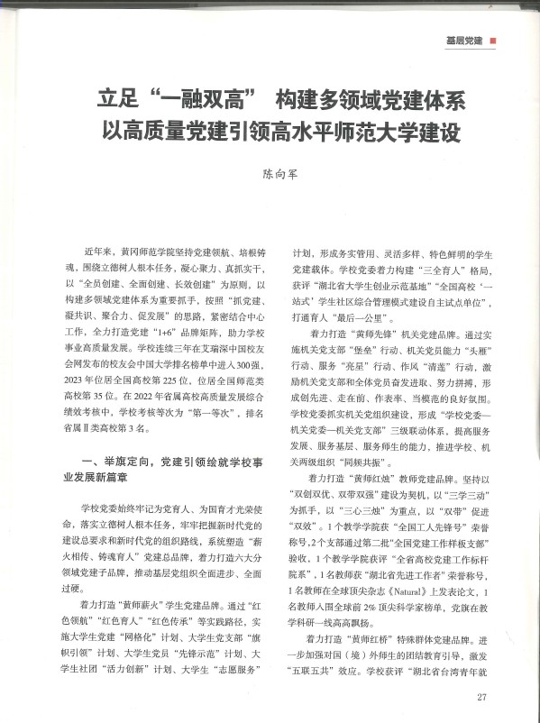 本网讯 “七一”前夕,中共湖北省委组织部、中共湖北省委党的建设工作领导小组办公室主办的《湖北党建》(2023年第3期)刊发校党委书记陈向军署名文章《立足“一融双高”党建引领构建多领域党建体系,以高质量党建引领高水平师范大学建设》。文章从“举旗定向,党建引领绘就学校事业发展新篇章”“培根铸魂,党建工作焕发新活力”“聚力赋能,党建融合彰显新高度”等三个方面,回顾总结我校开展党建工作的经验做法,全面展示我校党建工作新成效,以高质量党建推动学校事业高质量发展,以更高质量的美好黄师建设成效,为强国建设、民族复兴伟业贡献新的更大力量!