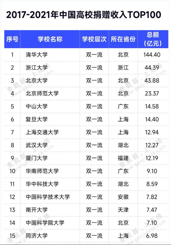 【黄师荣誉】我校荣登中国高校捐赠收入top100榜单